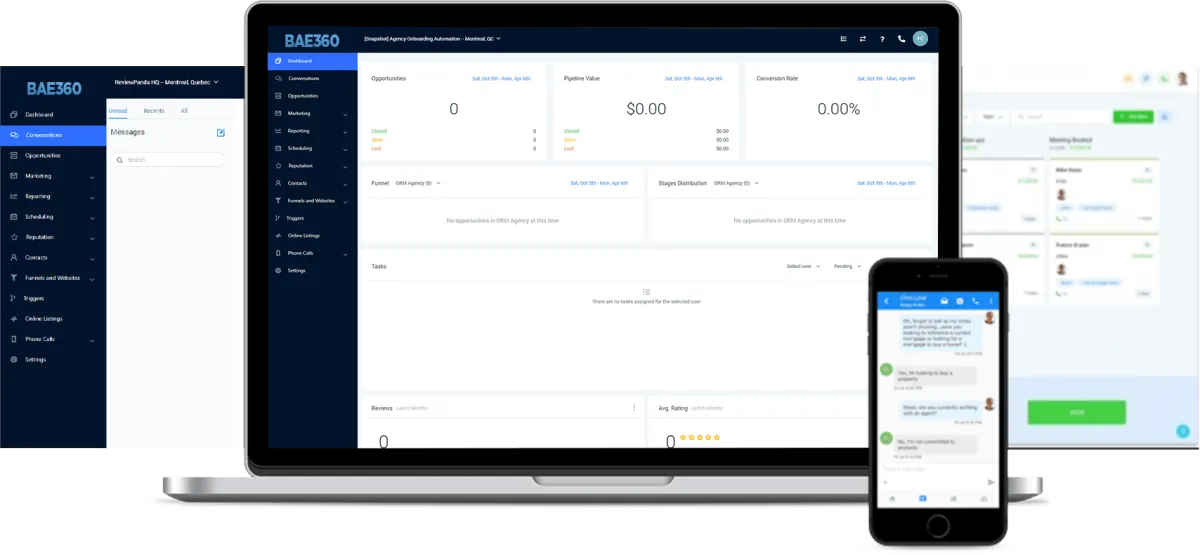 BAE360 is an all-in-one CRM, sales, and marketing and platform that replaces all of your tech subscriptions and runs your business efficiently in ONE place. It has everything you need to run and grow your business on autopilot.
